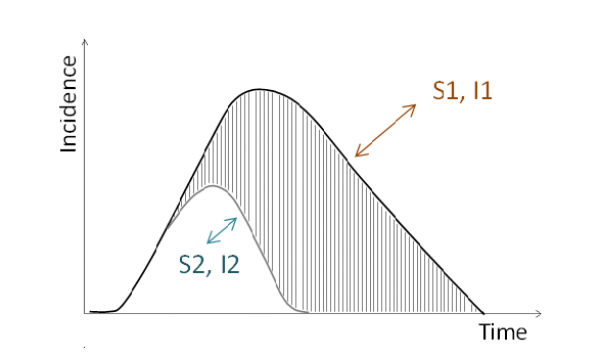 Figure 3: Comparison of two surveillance options (S1 and S2) and their associated interventions (I1 and I2) in a situation where S2 leads to earlier detection of disease and I2 to effective disease control. The hatched area represents the losses avoided with the more effective combination of S2 and I2.