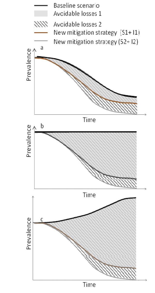 Figure 4: Comparison of two surveillance options and their associated interventions (S1&I1 and S2&I2) in a situation where the mitigation option 1 leads to disease reduction and the mitigation option 2 to disease elimination. A-c represent different baseline scenarios with decreasing, stable and increasing prevalence. The grey and hatched areas represent the losses avoided when the new strategies are compared to the baseline.