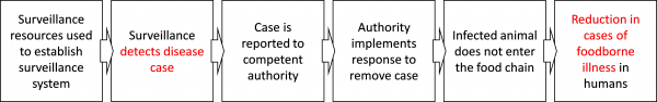 Figure 5: A schematic logic model to illustrate the steps that leads from surveillance to a reduction of foodborne illness in humans.In the example depicted in Figure 5, if the aim of mitigation is to avoid human cases (the value of such avoidance can be quantified) and only the case detection capacity of surveillance is to be assessed and compared to the costs of the surveillance, the link between the intermediate outcome (disease detection) and the final outcome (reduction in human cases) needs to be established.